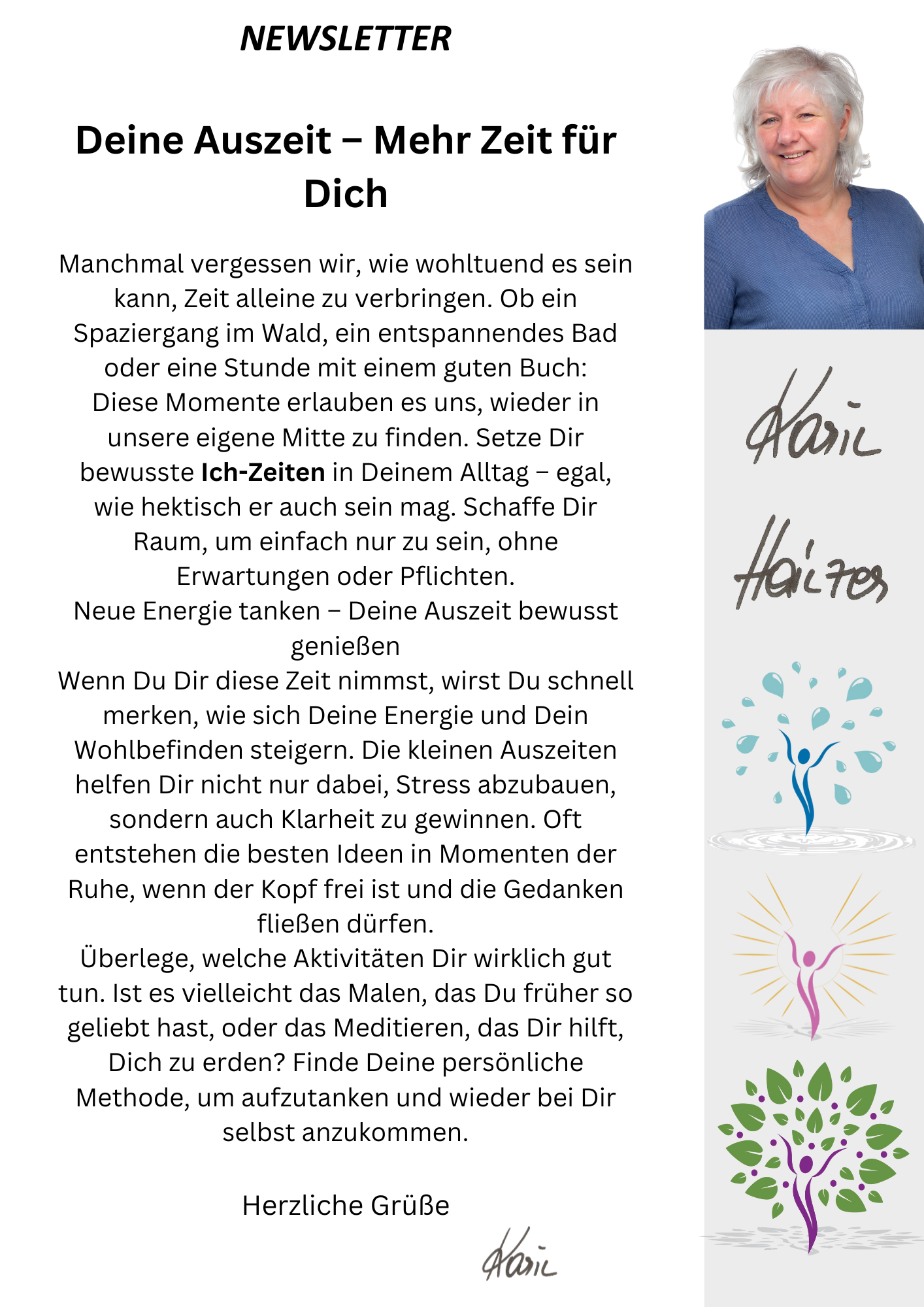 Lies mehr darüber im Newsletter! - Deine Auszeit30. September 2024Was tun, wenn Alltag, Stress und Anforderungen überhand nehmen?