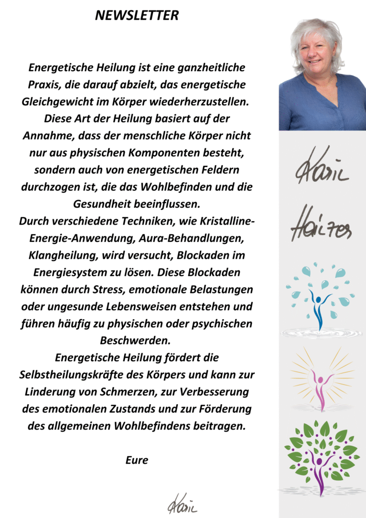 Dieser Newsletter bietet dir einen umfassenden Überblick über verschiedene energetische Heilmethoden und hebt die besondere Wirksamkeit der Kristalline-Energie-Anwendung hervor. Energetische Anwendungen können dir helfen, dein Wohlbefinden zu steigern und innere Balance zu finden.