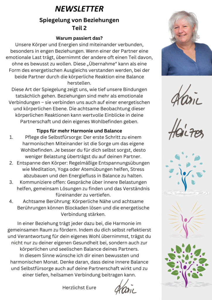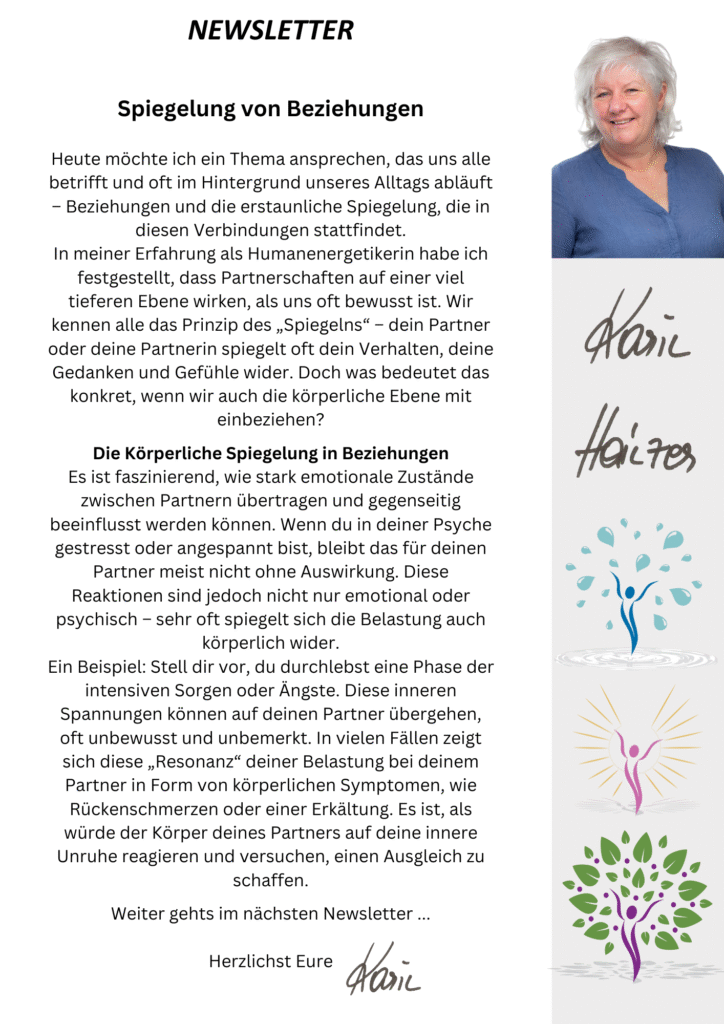 In diesem Newsletter (in 2 Teilen) geht es um die tiefe Verbindung zwischen Partnern und die körperliche Spiegelung emotionaler Zustände in Beziehungen. Belastungen, die wir innerlich tragen, können sich oft körperlich auf unseren Partner auswirken. Tipps zur Selbstfürsorge und Entspannung helfen dabei, eine harmonische, energetische Balance in der Partnerschaft zu fördern.